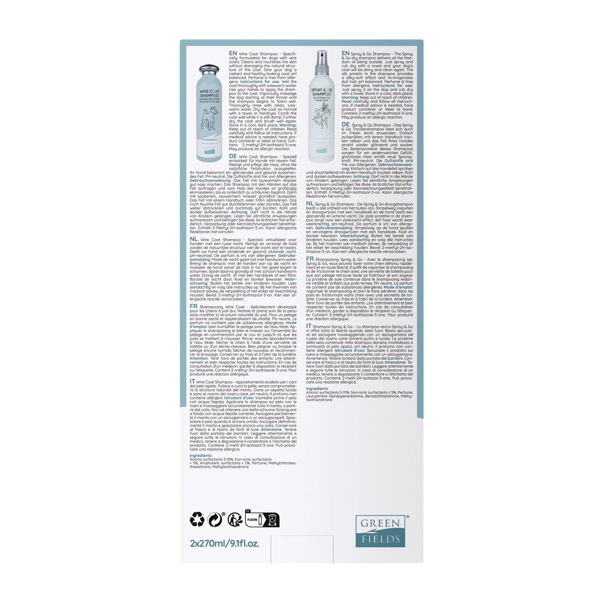 Bent u op zoek naar vachtverzorging speciaal voor uw hond? Dan is de Dachshund Care Set van Greenfields de oplossing! Deze set bestaat uit een shampoo voor de ruwe vacht en een handige droogshampoo voor onderweg. De Greenfields Wire Coat Shampoo houdt de ruwe textuur van de vacht van uw hond vast, zonder dat de natuurlijke oliën van de huid worden aangetast. Met de Greenfields Spray & Go maakt u de vacht van uw trouwe viervoeter binnen een mum van tijd weer fris en schoon, zonder dat daar water voor nodig is!