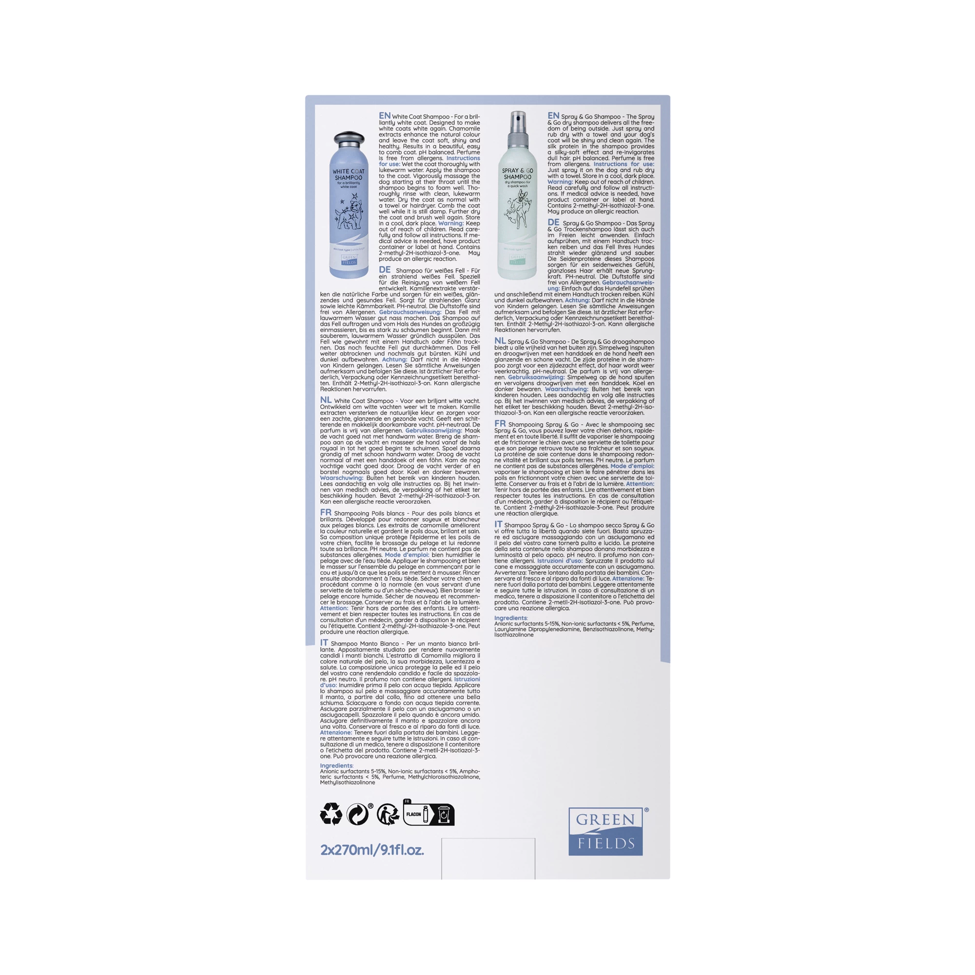 Om de vieze witte vacht van uw hond weer mooi wit te krijgen is de Malteser Care Set van Greenfields dé oplossing! Deze verzorgingsset bestaat uit een shampoo, speciaal voor de witte vacht en een handige droogshampoo voor onderweg. De Greenfields White Coat Shampoo bevat een unieke formule die de natuurlijke witte vachtkleur van uw hond versterkt. Daarnaast kan de shampoo helpen tegen vergeling van de vacht. Het product draagt tevens bij aan een zachte, glanzende en gezonde vacht. Heeft u geen tijd om uw hond uitgebreid te wassen? Kies dan voor de Greenfields Spray & Go. Voor deze droogshampoo is geen water benodigd; perfect voor onderweg, op hondenshows of tussendoor.