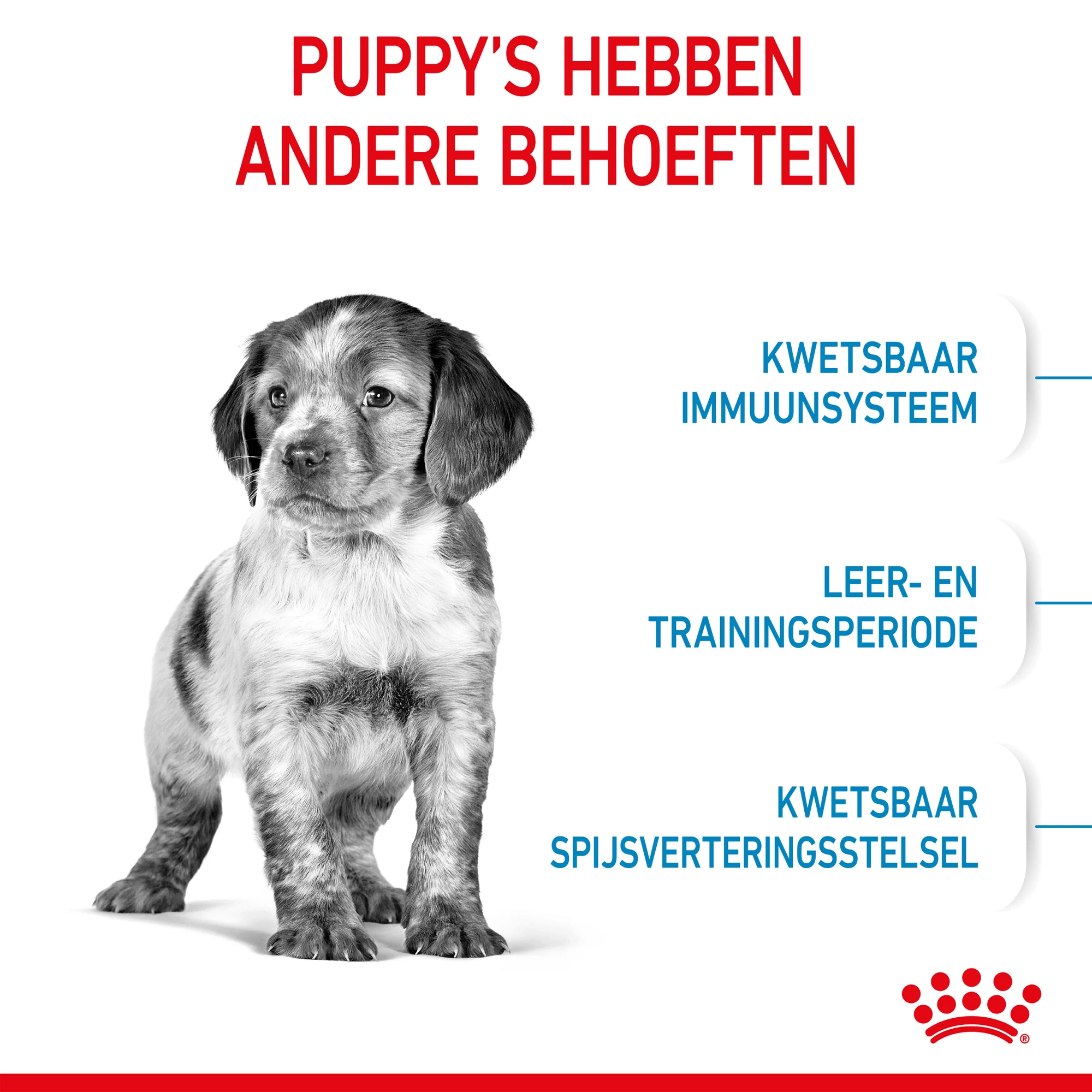 Puppy’s van middelgrote rassen tot 12 maanden met een volwassen gewicht tussen 11 en 25 kg
