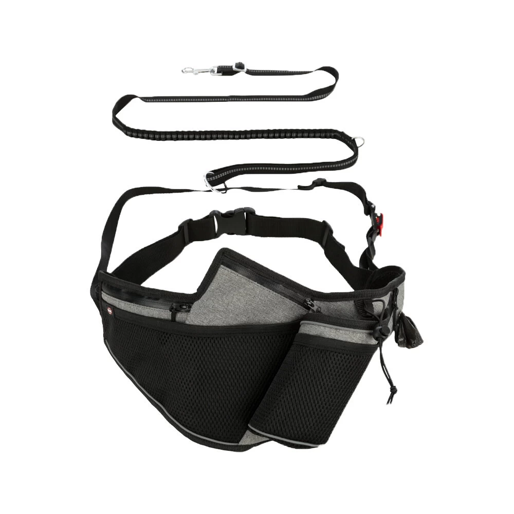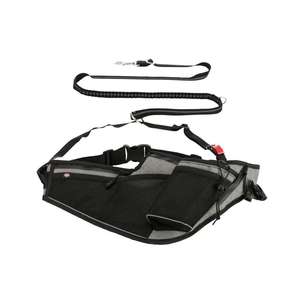 Omdat het veel leuker is om samen met uw viervoeter te joggen, walken of fietsen is er de Trixie Jogging Riem met Leiband. Deze ceintuur heeft een makkelijk aanlijn-systeem waardoor de impact van het trekken van de hond gelijkmatig over de taille van de loper wordt verdeeld. Ook wordt het plotseling trekken van de hond door een schokdemper opgevangen. De Joggingceintuur heeft een aangenaam draagcomfort door het ergonomisch ontwerp en een zacht inzetstuk gemaakt van mesh. De ceintuur beschikt over diverse vakken en een bekerhouder, waterdichte ritssluitingen en een geïntegreerde poepzakjes-dispenser.