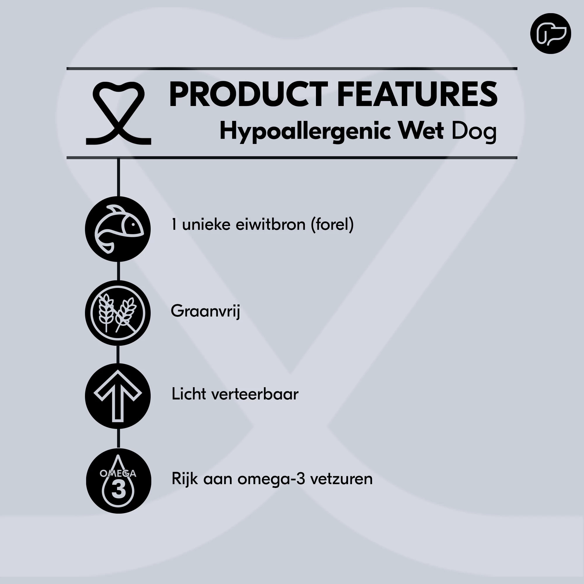 Voedselallergie betekent dat uw hond overgevoelig reageert op bepaalde ingrediënten in de voeding. Het is dan belangrijk deze ingrediënten te vermijden. Vetality Hypoallergenic maakt gebruik van één unieke eiwitbron (forel). De voeding bevat geen koolhydraatbron en is vrij van granen. Zo wordt de kans op een voedselallergie zeer klein. De ingrediënten zijn licht verteerbaar. Hiermee draagt het zorg voor een optimale spijsvertering en gezonde darmflora. Omega-3 vetzuren dragen bij aan een gezonde huid door deze te voeden en te beschermen.