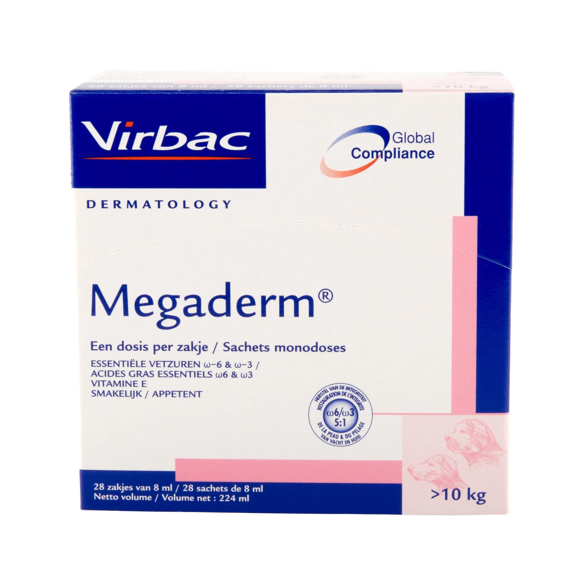 Megaderm is een smakelijk aanvullend diervoeder voor hond en kat op basis van essentiële vetzuren, zink en vitaminen. Megaderm dient ter bevordering van de gezondheid van huid en vacht.