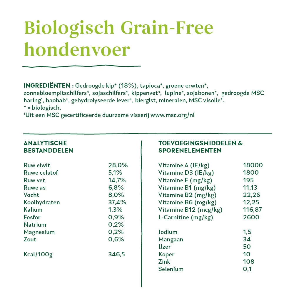 Gedroogde kip* (18%), tapioca*, groene erwten*, zonnebloempitschilfers*, sojaschilfers*, kippenvet*, lupine*, sojabonen*, gedroogde MSC haring¹, baobab*, gehydrolyseerde lever*, biergist, mineralen, MSC visolie¹. * = biologisch.